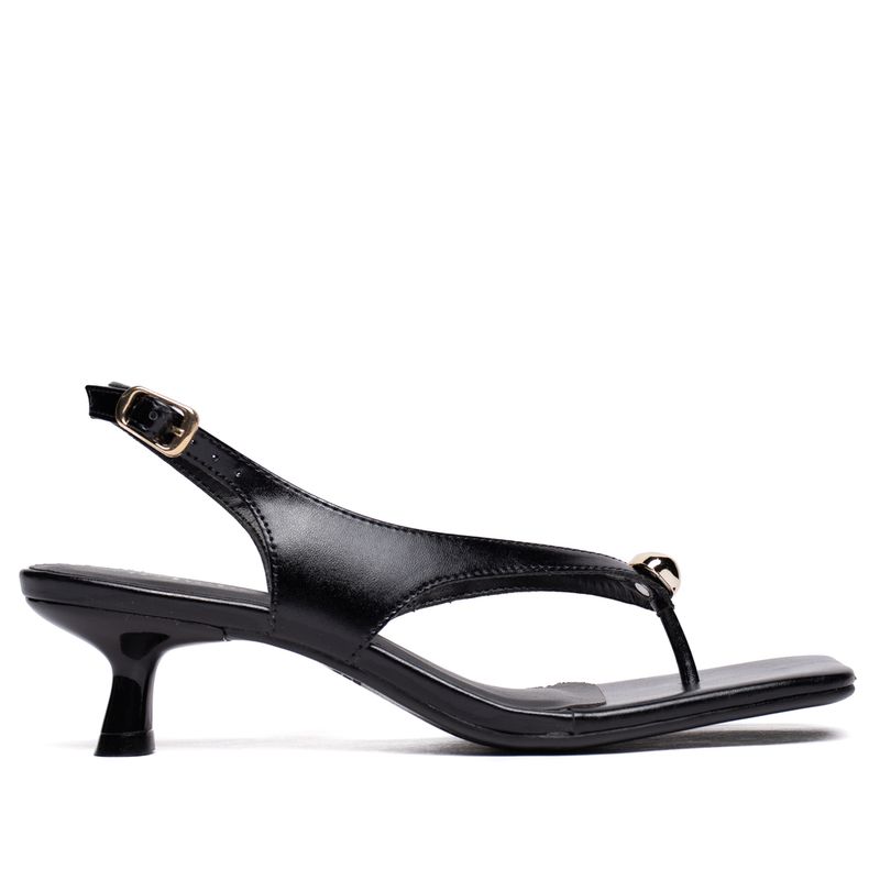 Com salto baixo estilo kitten heel de 5 cm, proporciona estabilidade e conforto para uso prolongado. Suas tiras finas com detalhe metalizado garantem um toque moderno e delicado, enquanto a tira traseira com fechamento em fivela oferece ajuste seguro e prático.