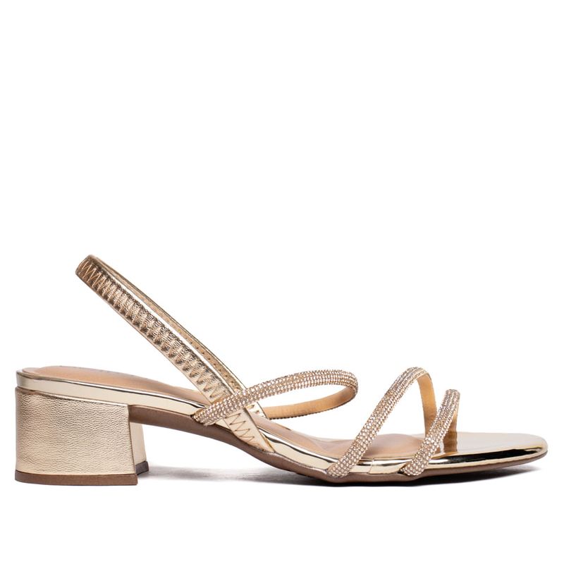 As tiras finas com aplicação de strass oferecem brilho discreto e moderno, adicionando um toque glamouroso ao look. O acabamento metalizado destaca a sandália e permite combinações versáteis - desde produções festivas até composições casuais mais refinadas. O salto bloco médio de 5 cm oferece estabilidade e conforto no uso prolongado, enquanto o design slingback proporciona ajuste seguro e sensação de firmeza ao caminhar. A palmilha macia contribui para absorção de impactos e bem-estar durante todo o dia.