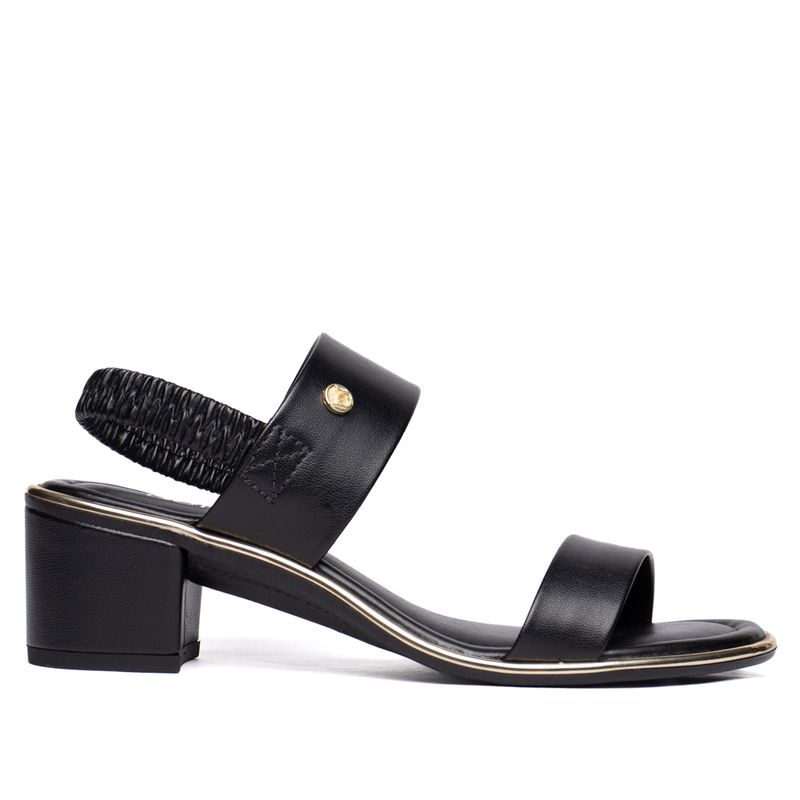 Seu cabedal em napa sintética traz tiras que se destacam pelo design diferenciado: uma larga na parte frontal, outra mais grossa na parte superior dos pés com detalhe do logo da marca e uma tira enrugada que abraça o tornozelo, conferindo charme especial. A palmilha em espuma macia garante conforto prolongado, enquanto o salto bloco médio de 5 cm oferece estabilidade e bem-estar em cada passo. O detalhe dourado que circunda a base da sandália reforça o toque sofisticado do modelo.