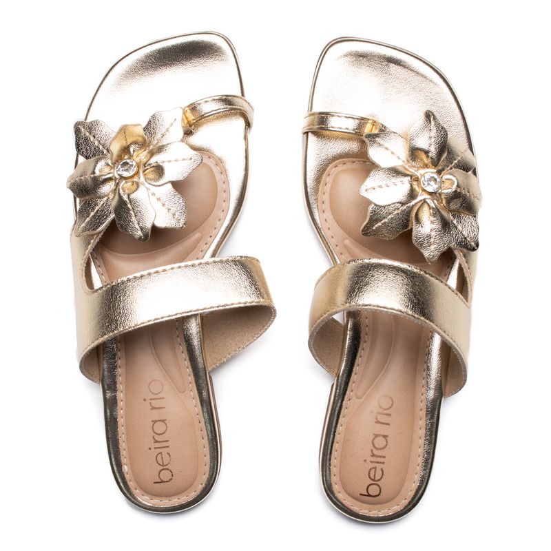 Nome do produto: Rasteira Feminina Beira Rio Metalizada Flor Dourado
