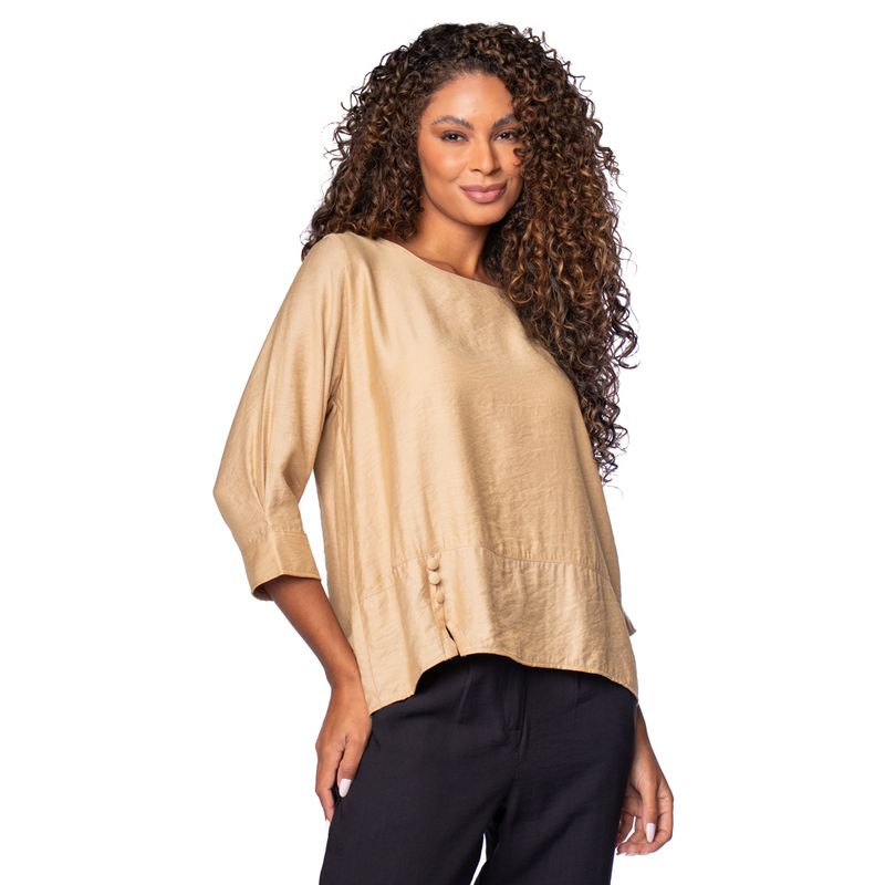 Blusa ampla, barra com recorte, detalhes com botões na manga e parte frontal.