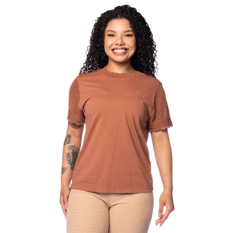 Produzida em 100% algodão, possui mangas em pontos vazados que adicionam leveza e sofisticação ao visual. A gola redonda e o acabamento em fibras naturais reforçam o caimento macio e agradável ao vestir. Veste bem e valoriza a silhueta. O Marrom é uma cor atemporal, que garante praticidade nas combinações.