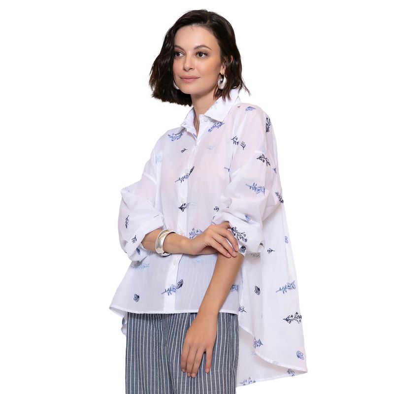Camisa Feminina Biamar Ampla Sofia Bordados Branco/Azul