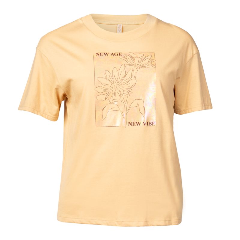 Com manga curta e modelagem solta, garante liberdade de movimento e conforto durante toda a rotina. O destaque fica por conta da estampa localizada com ilustração de flores e o detalhe holográfico, que adiciona charme e um toque moderno ao visual.