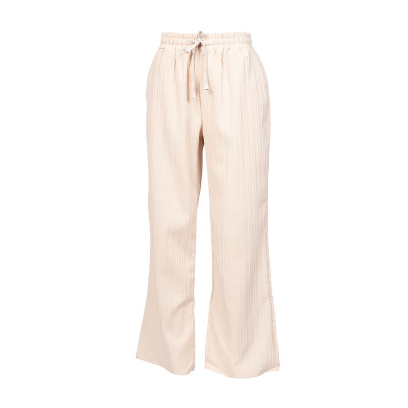 Diferencial: calça solta com caimento leve, feita em tecido com textura de listras verticais, com cordão embutido no cós para ajuste e bolsos funcionais