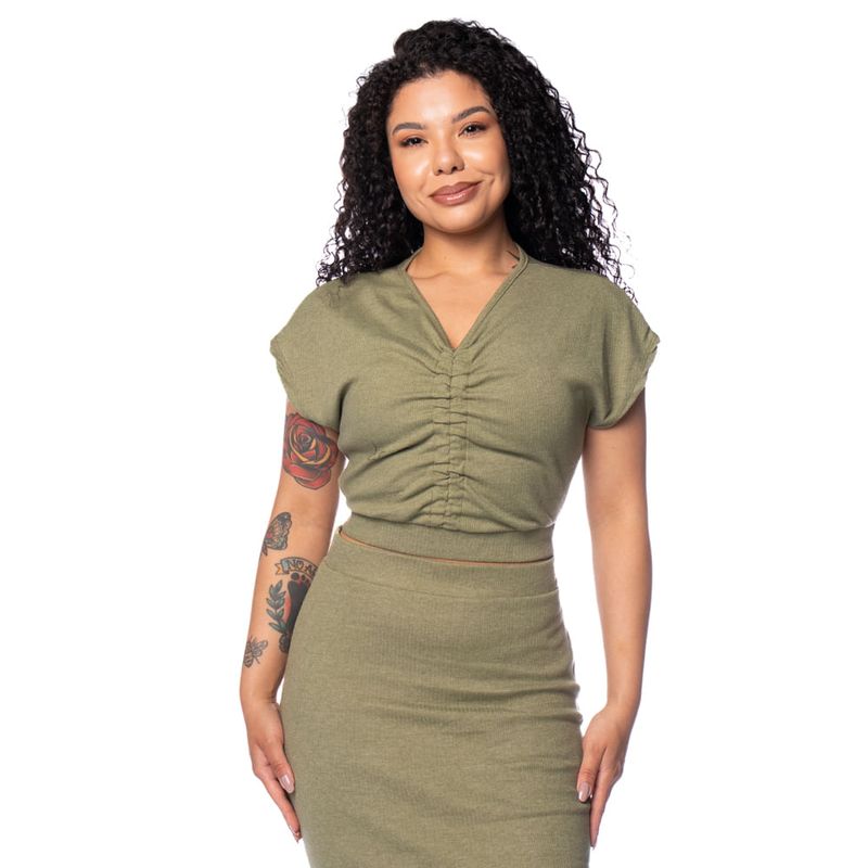 • A Blusa Feminina Habana Cropped Canelada Verde é a escolha ideal para quem busca praticidade no dia a dia sem abrir mão do estilo. O franzido frontal valoriza o visual de forma sutil, trazendo um toque moderno e delicado à peça.