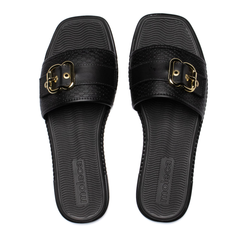 CALÇADOSFEMININOSAPATILHASRasteira Feminina Slide Moleca Napa Fivela Dourada Preto