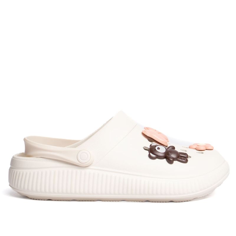 Confeccionada em EVA leve e resistente, proporciona suavidade ao caminhar e alta durabilidade. A tira traseira em PVC ajustável garante ajuste firme e seguro, enquanto a palmilha anatômica em EVA oferece conforto prolongado durante o uso. O solado leve assegura estabilidade e flexibilidade em cada passo. O destaque fica por conta dos pins decorativos inclusos - ursinho, laço e flor - que permitem personalização divertida, deixando o modelo ainda mais especial e cheio de personalidade.