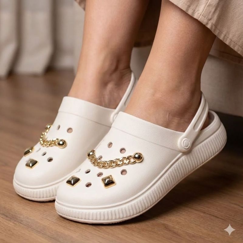 Produzida em EVA leve e resistente, a sandália oferece maciez a cada passo, além de excelente durabilidade. A palmilha anatômica garante sensação agradável ao caminhar, enquanto a tira traseira em PVC ajustável proporciona segurança e estabilidade durante o uso. O grande diferencial da Sandália Babuche Feminina Moleca está nos pins dourados decorativos em formato de corrente, que trazem charme extra e permitem um visual autêntico e divertido. O solado leve e flexível complementa o conforto do modelo.