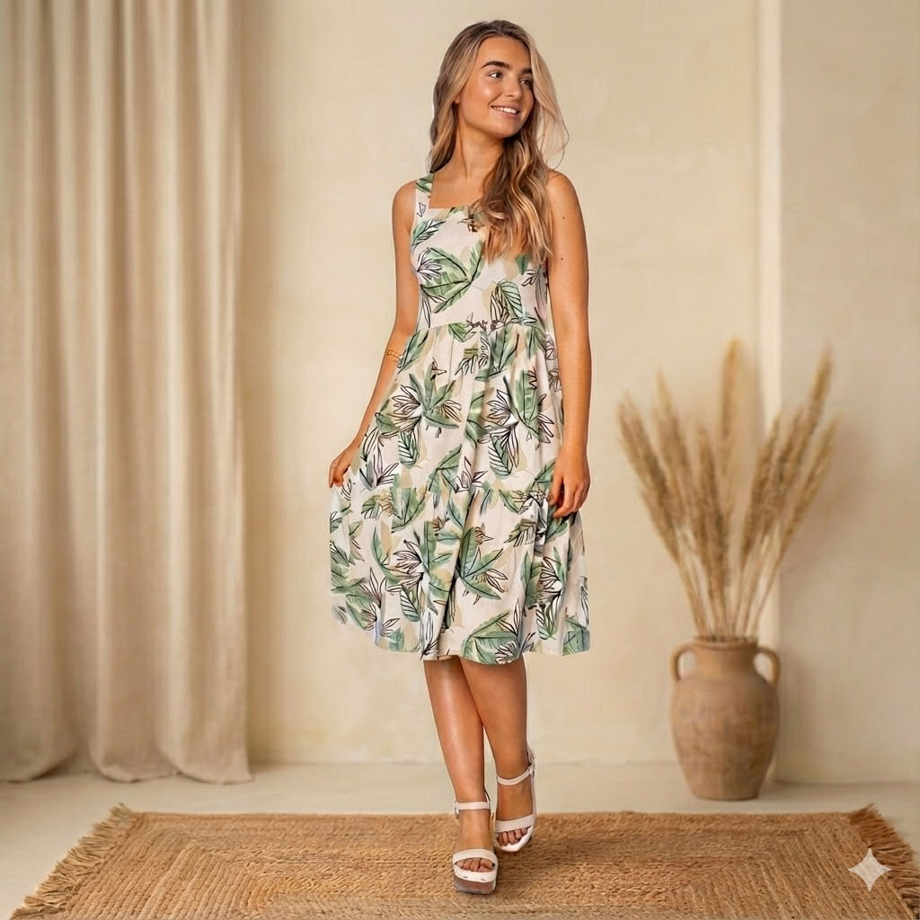 Perfeito para combinar com sandálias e acessórios delicados, o Vestido Feminino Rechsul Estampa Folhas é uma peça versátil que alia conforto e estilo em uma produção charmosa e descomplicada para o dia a dia.