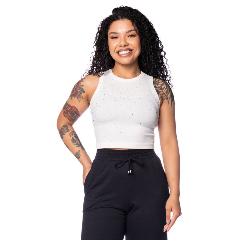 Confeccionada em malha canelada de poliéster com elastano, proporciona ajuste flexível e confortável ao corpo. A modelagem justa com alças largas valoriza a silhueta, enquanto a gola careca reforça o visual clássico e moderno. O diferencial da peça está na parte frontal estampada com aplicações brilhosas, que adicionam charme e personalidade ao design. Um detalhe que transforma a regata em uma peça única e sofisticada.