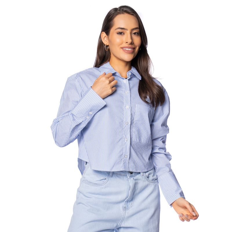 Camisa Feminina The Style Box Social Cropped Azul/Branco