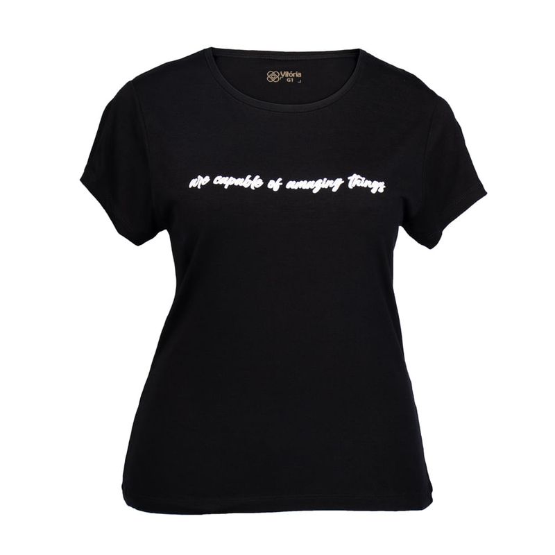 Confeccionada em malha macia de viscose com elastano, oferece excelente caimento, toque suave e conforto térmico. O destaque fica por conta da estampa em lettering branco em relevo com a frase are capable of amazing things, que transmite uma mensagem positiva e motivadora. Com modelagem plus size, mangas curtas e gola careca, proporciona liberdade de movimento e valorização das curvas de forma natural. A tonalidade preta clássica garante versatilidade nas combinações, perfeita para o dia a dia ou momentos de lazer.