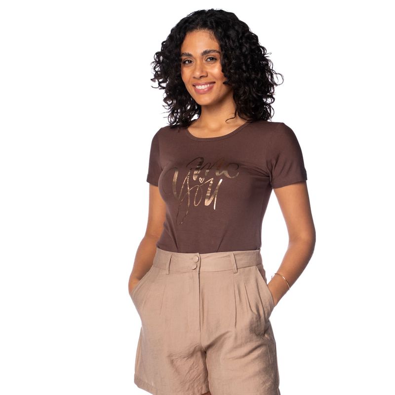 Confeccionada em malha leve de viscose com elastano, oferece maciez, elasticidade e caimento fluido, garantindo liberdade de movimento e bem-estar em todas as ocasiões. A modelagem com gola redonda e mangas curtas proporciona praticidade e um visual descomplicado. O destaque fica por conta da estampa central com o lettering Me Love You, que apresenta acabamento envernizado e brilho sutil, tornando a peça elegante e contemporânea. O design minimalista e a cor marrom reforçam o estilo sofisticado e versátil.