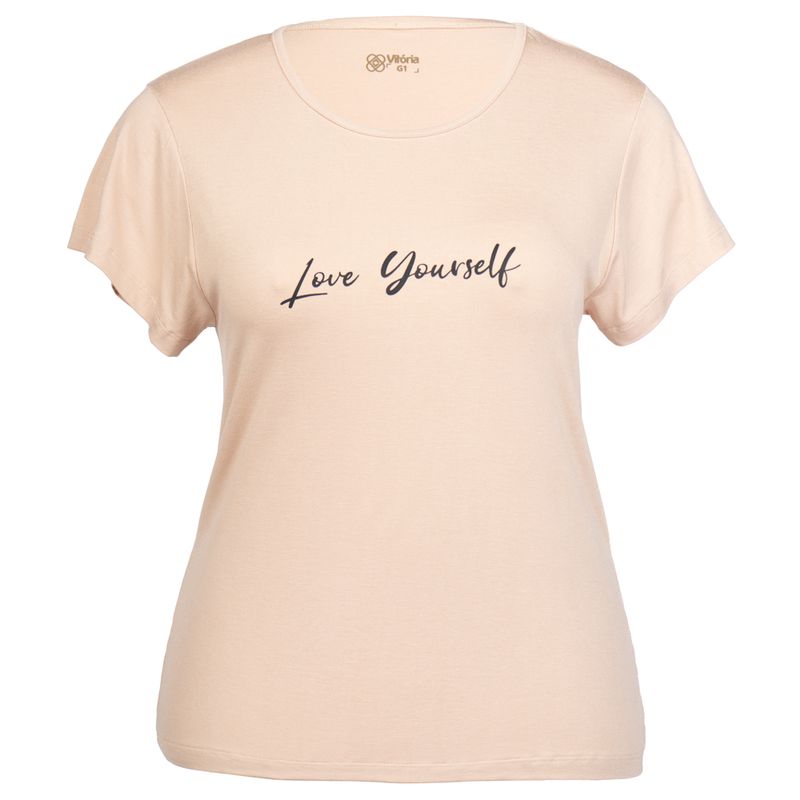 Confeccionada em malha de viscose com elastano, oferece toque macio, excelente caimento e conforto térmico em todas as ocasiões. O destaque fica por conta da estampa em lettering com os dizeres love yourself em tom preto, que transmite autoconfiança e reforça o charme casual da peça. Com modelagem plus size, gola careca e mangas curtas, proporciona liberdade de movimento e caimento natural, valorizando a silhueta com leveza. O tom bege neutro torna o modelo versátil, ideal para compor looks modernos e elegantes.