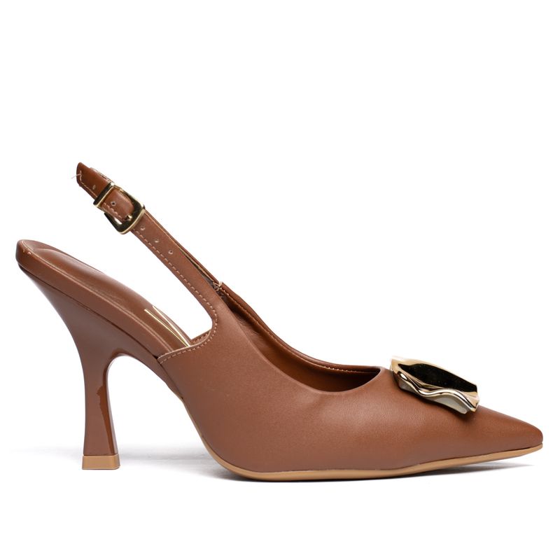 Adereço dourado em forma orgânica no cabedal e salto alto fino